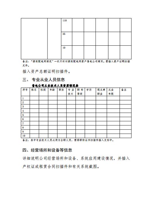 4. 需提供至少10名以上專(zhuān)業(yè)人員相關(guān)材料,包括:勞動(dòng)合同、學(xué)歷證書(shū)、社保繳納證明(必須提供所有專(zhuān)業(yè)人員的上述材料)和專(zhuān)業(yè)技術(shù)職稱(chēng)證書(shū)(如無(wú)可不提供)。專(zhuān)業(yè)人員必須為全職人員,至少具有3個(gè)中級(jí)職稱(chēng)和1個(gè)高級(jí)職稱(chēng),中、高級(jí)職稱(chēng)專(zhuān)業(yè)人員中至少有1名電力相關(guān)專(zhuān)業(yè)和1名經(jīng)濟(jì)相關(guān)專(zhuān)業(yè)人員。退休返聘人員最多計(jì)為2人,且年齡不超過(guò)70歲。