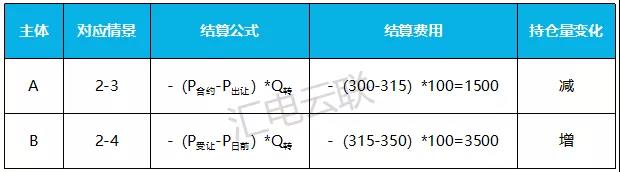 情景2:假設售電公司A將其持有的100MWh原始價格為300元/MWh的購電合約以315元/MWh元轉讓給售電公司B。實際發(fā)生的日前綜合電價為350元/MWh。該示例對應表格中的2-3,2-4情景,查詢對應公式,其結算如下: