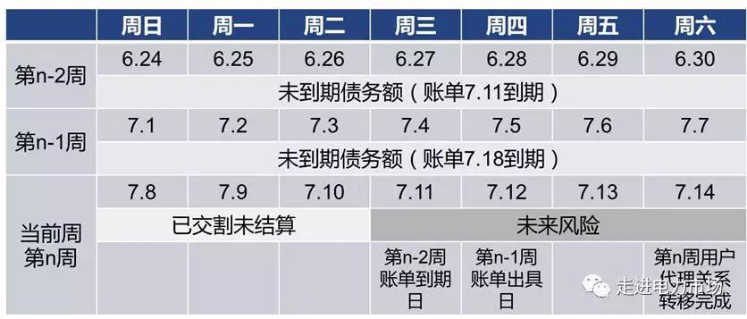 如果售電公司在7月11日這天被禁止市場(chǎng)交易,那么按照結(jié)算流程其需要繳納但仍未繳納的費(fèi)用覆蓋了三個(gè)完整的周,所以風(fēng)險(xiǎn)期長度必須至少設(shè)置為三周才是比較穩(wěn)妥的。同理,如果結(jié)算周期是以月為單位的“日清月結(jié)”,用戶代理關(guān)系轉(zhuǎn)移至少需要一個(gè)月,甚至允許市場(chǎng)主體在有歷史欠費(fèi)的情況下進(jìn)行市場(chǎng)交易,那么風(fēng)險(xiǎn)期的長度則至少設(shè)置為數(shù)月。較長的結(jié)算周期會(huì)給市場(chǎng)主體帶來較大的交易成本負(fù)擔(dān)。