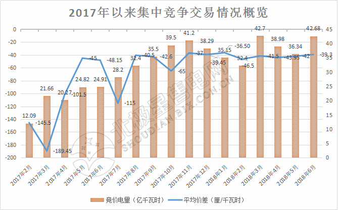 廣東 6月月度集中競(jìng)爭(zhēng)交易于5月29日上午11時(shí)落下帷幕,成交電量為42.68億千瓦時(shí),成交價(jià)差-39.3厘/千瓦時(shí),持續(xù)走低,并在4個(gè)月后再次回歸至-4分以內(nèi),至此廣東上半年月度集中競(jìng)爭(zhēng)交易接近尾聲。通過(guò)下面兩張圖可以看出,與2017年相比,今年上半年的月競(jìng)價(jià)差非常平穩(wěn),并一直維持在較低水平。