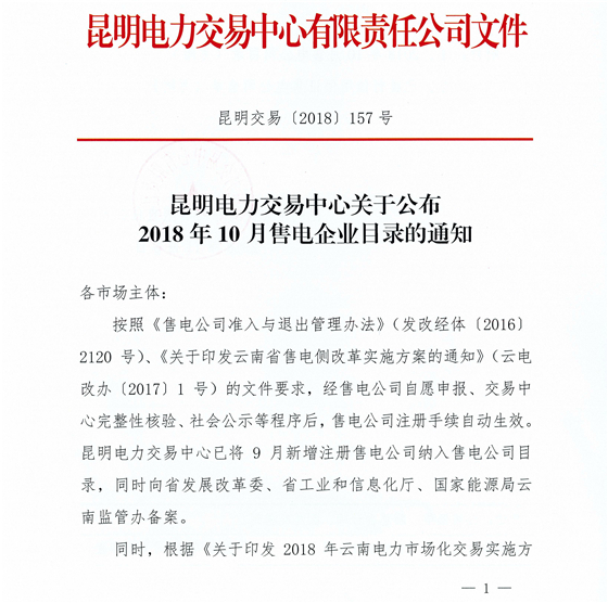昆明電力交易中心日前發(fā)布了《昆明電力交易中心關于公布2018年10月售電企業(yè)目錄的通知》,按照《售電公司準入與退出管理辦法》(發(fā)改經體(2016)2120號)、《關于印發(fā)云南省售電側改革實施方案的通知》(云電改辦(2017)1號)的文件要求,經售電公司自愿申報、交易中心完整性核驗、社會公示等程序后,售電公司注冊手續(xù)自動生效。