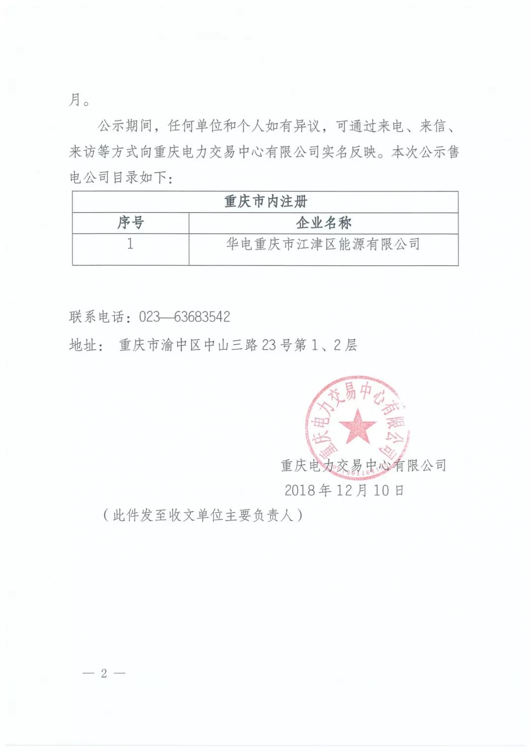 重慶公示受理注冊的售電公司有關(guān)信息的公告(2018年第十二批)