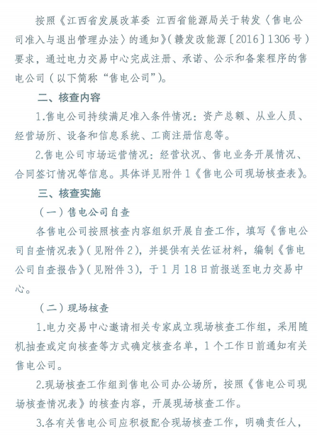 核查分為售電公司自查與現(xiàn)場核查兩部分,售電公司需要將自查報(bào)告于1月18日前報(bào)送。