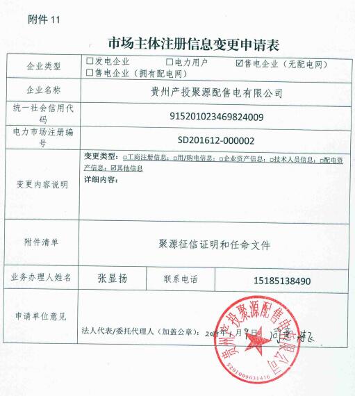 因貴州盤江電投發(fā)電有限公司、貴州黔桂電能配售電有限責任公司、大唐貴州能源營銷有限公司、貴州貴能投資股份有限公司水城縣比德騰慶煤礦、國家電投集團貴州金元配售電有限公司、貴州盤江電力有限公司、貴州產(chǎn)投聚源配售電有限公司、貴州易能達能源服務有限公司等8家市場主體提出注冊信息變更申請,按照《貴州省電力中長期交易規(guī)則(試行)》(黔監(jiān)能市場〔2017〕112 號)、《貴州省電力市場主體注冊管理辦法》(黔電交易〔2018〕154號)相關規(guī)定,以上8家市場主體提交注冊信息變更資料通過貴州電力交易中心初步審核。