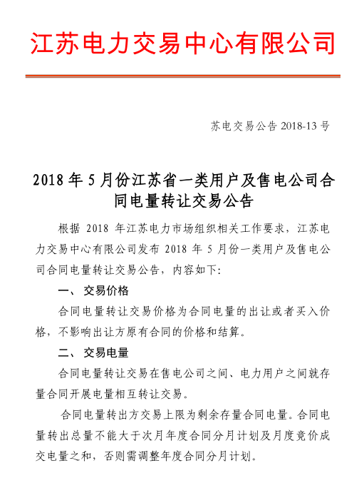 2018年5月份江蘇省一類用戶及售電公司合同電量轉(zhuǎn)讓交易展開
