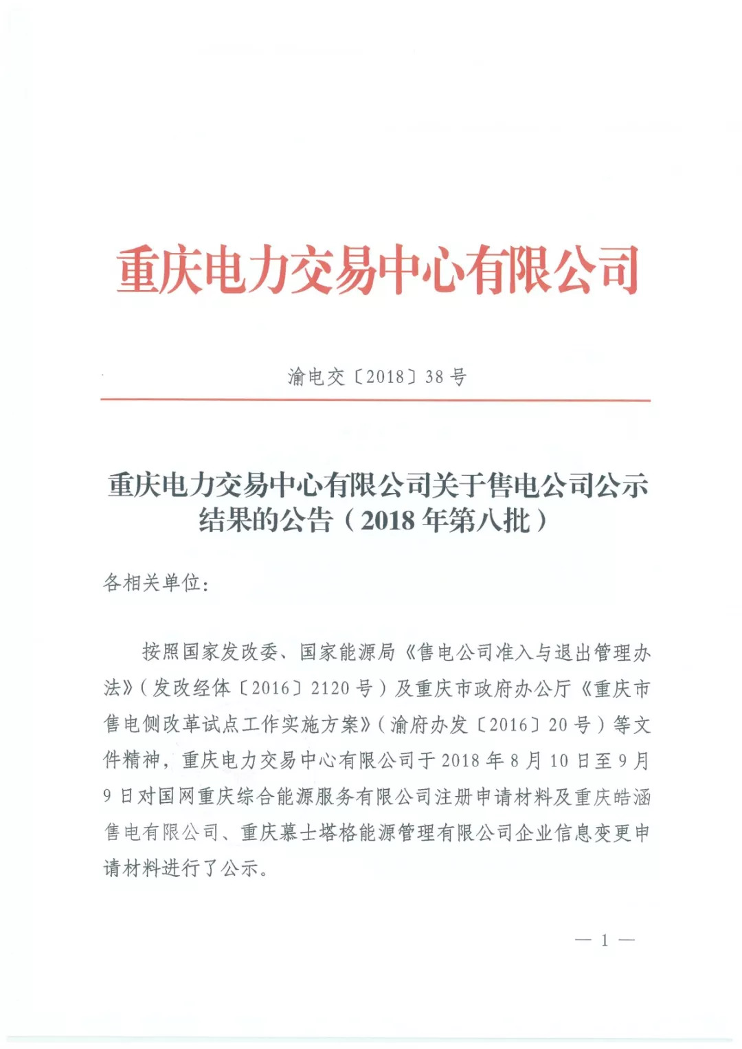 重慶電力交易中心日前發(fā)布了《關(guān)于售電公司公示結(jié)果的公告(2018年第八批)》,于2018年8月10日至9月9日對國網(wǎng)重慶綜合能源服務(wù)有限公司注冊申請材料及重慶皓涵售電有限公司、重慶慕士塔格能源管理有限公司企業(yè)信息變更申請材料進行了公示。