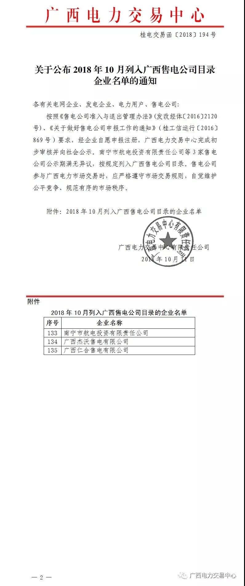 關(guān)于公布2018年10月列入廣西售電公司目錄