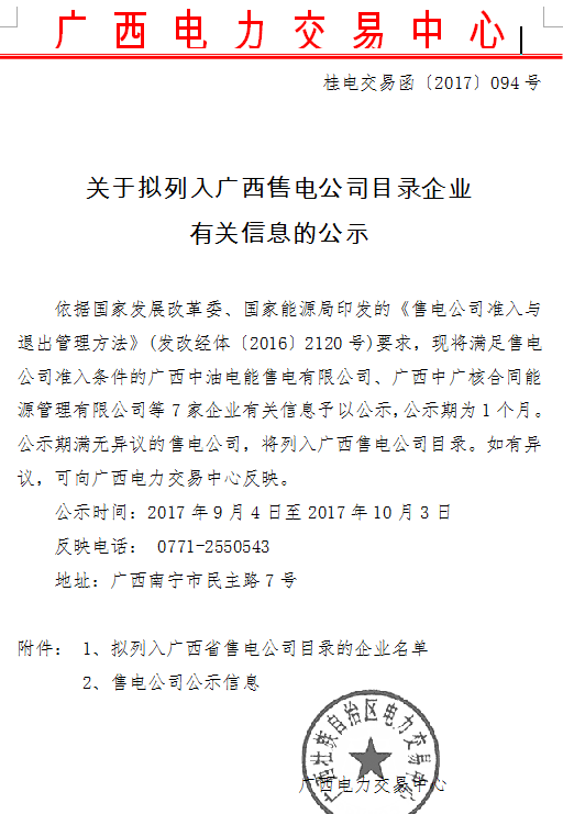 依據(jù)國家發(fā)展改革委、國家能源局印發(fā)的《售電公司準(zhǔn)入與退出管理方法》(發(fā)改經(jīng)體〔2016〕2120號)要求,現(xiàn)將滿足售電公司準(zhǔn)入條件的廣西中油電能售電有限公司、廣西中廣核合同能源管理有限公司等7家企業(yè)有關(guān)信息予以公示,公示期為1個月。公示期滿無異議的售電公司,將列入廣西售電公司目錄。如有異議,可向廣西電力交易中心反映。