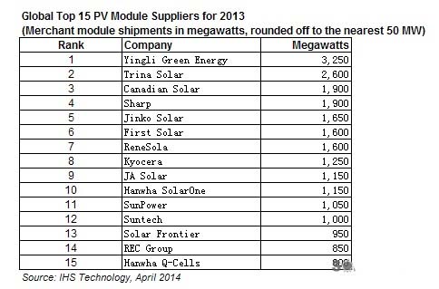 據(jù)IHS透露,這份報告的調(diào)查范圍涉及全球150家光伏組件制造商。去年,全球前十大太陽能組件供應(yīng)商中,有七家企業(yè)的總部或大型制造運營中心位于中國。2013年,英利綠色能源以3.25吉瓦的光伏組件出貨量榮居榜首,緊隨其后的是天合光能、阿特斯太陽能、日本夏普以及晶科能源。