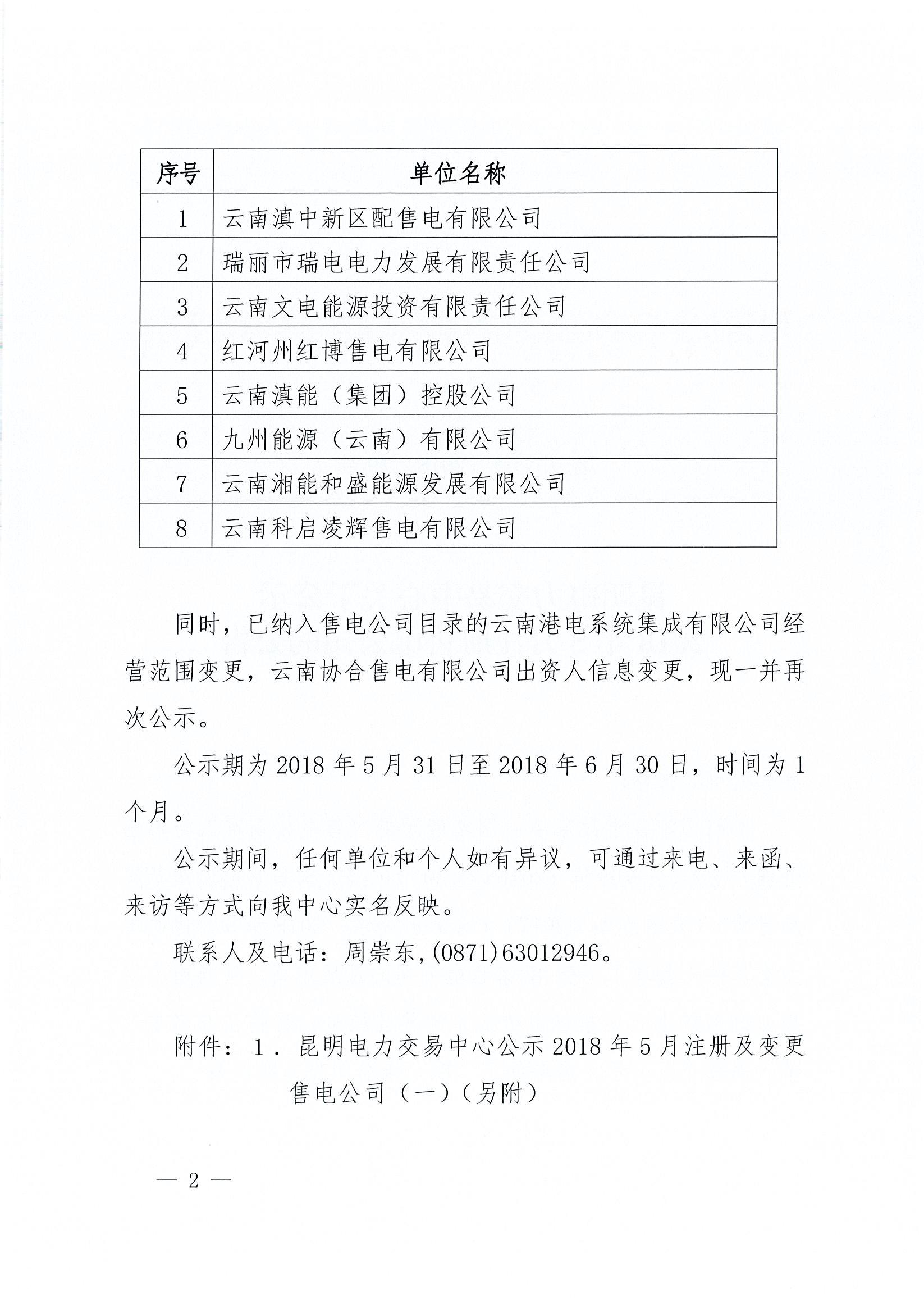 昆明電力交易中心日前發(fā)布了《關(guān)于公示2018年5月注冊(cè)售電公司的公告》,昆明電力交易中心受理了8家售電公司的注冊(cè)申請(qǐng),公示期為2018年5月31日至2018年6月30日。詳情如下: