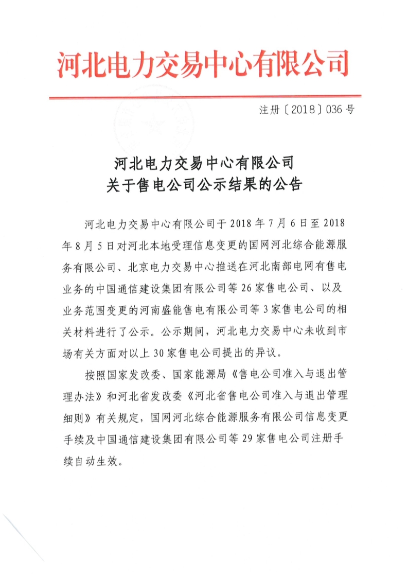 河北電力交易中心日前發(fā)布了《河北電力交易中心有限公司關(guān)于售電公司公示結(jié)果的公告》,于2018年7月6日至2018年8月5日對河北本地受理信息變更的國網(wǎng)河北綜合能源服務(wù)有限公司、北京電力交易中心推送在河北南部電網(wǎng)有售電業(yè)務(wù)的中國通信建設(shè)集團(tuán)有限公司等26家售電公司、以及業(yè)務(wù)范圍變更的河南盛能售電有限公司等3家售電公司的相關(guān)材料進(jìn)行了公示。公示期內(nèi)未收到市場對以上30家售電公司提出的異議?,F(xiàn)國網(wǎng)河北綜合能源服務(wù)有限公司信息變更手續(xù)及中國通信建設(shè)集團(tuán)有限公司等29家售電公司注冊手續(xù)自動生效。詳情如下: