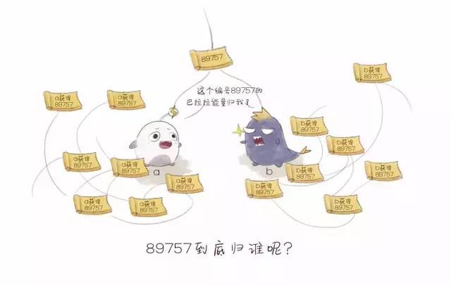 在這一段的論述中,我們引用了知乎用戶(hù)“汪樂(lè)–LaiW3n”的說(shuō)法。在這個(gè)廣闊的小城市里,一定還會(huì)存在這樣的問(wèn)題,B和C幾乎同時(shí)記錄完了,于是同時(shí)向天空大喊了一聲,“這個(gè)編號(hào)89757的巴拉拉能量歸我了”。但是,由于這個(gè)城市太廣闊了,有的人會(huì)認(rèn)為這個(gè)編號(hào)89757的巴拉拉能量歸B,也有的人認(rèn)為這個(gè)編號(hào)89757的巴拉拉能量歸C,但是編號(hào)89757的巴拉拉能量只有一個(gè)啊,只有一個(gè)人能得到,怎么辦呢?一人一半?當(dāng)然是不可能的,這個(gè)時(shí)候我們會(huì)采用更原始簡(jiǎn)單的規(guī)則來(lái)解決,誰(shuí)長(zhǎng)聽(tīng)誰(shuí)的。
