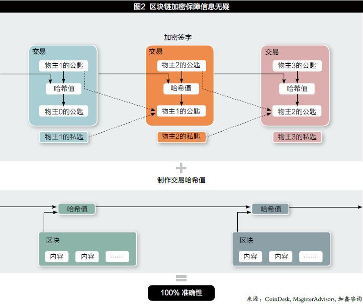 公私鑰匙、歷史時(shí)序、哈希值、隨機(jī)生成、高速網(wǎng)絡(luò),超大算力,當(dāng)這些要素疊加在一起時(shí),中本聰(Satoshi Nakamoto)和他的網(wǎng)絡(luò)伙伴就制造出可以顛覆中央集權(quán)控制的比特幣,其背后的核心技術(shù)便是區(qū)塊鏈。區(qū)塊鏈加密保障信息無疑的過程圖如2所示。