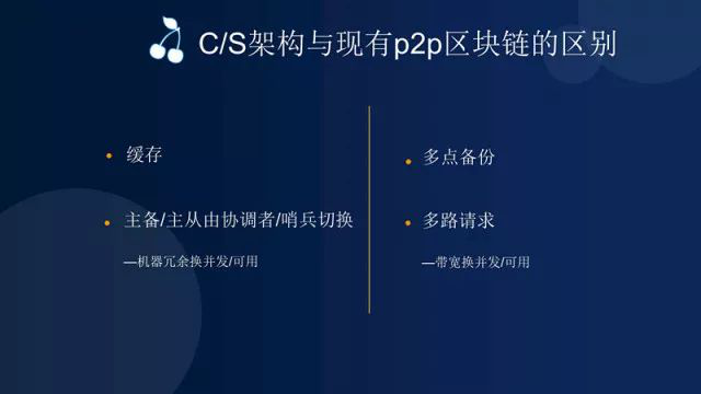 接下來講一下傳統(tǒng)C/S架構和現(xiàn)有P2P架構有什么區(qū)別,其實這一塊更多是數(shù)據(jù)處理這一塊,傳統(tǒng)后端是有很多緩存的,用緩存提高并發(fā)。同時用主備、主從做高并發(fā)高可用。用協(xié)調者或者哨兵做切換,主備就是主服務器斷了,我的備服務器是很快切換過去成為主服務器,像F5是毫秒級的切換,主從就是我的從節(jié)點可以復制主節(jié)點數(shù)據(jù)提供讀取,我如果讀數(shù)據(jù)的話,我就從從服務器去走,如果要寫數(shù)據(jù),就從主服務器。但是同一個請求,一般只有一個節(jié)點。而在P2P系統(tǒng)里面,它是節(jié)點非常不穩(wěn)定的系統(tǒng),經(jīng)常關機,帶寬也不能保障,所以節(jié)點是很不靠譜的,所以會向好多節(jié)點請求想要的數(shù)據(jù),一方面提高性能和可用性,另外一方面會耗費很多帶寬和計算成本。
