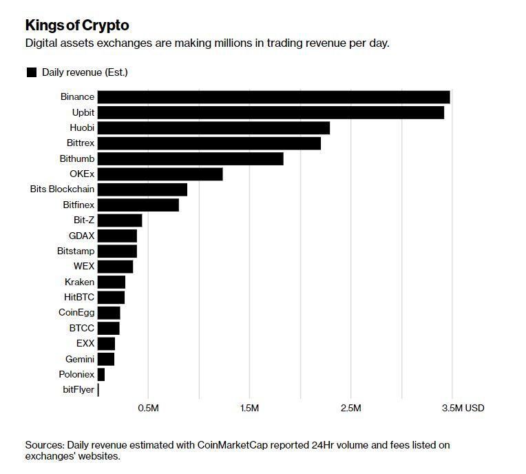 上圖反映了知名虛擬貨幣交易平臺的日營收排名情況,Binance和Upbit的日營收已達近350萬美元