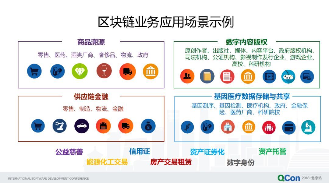 區(qū)塊鏈的業(yè)務(wù)應(yīng)用場(chǎng)景非常的豐富,相信大家在國(guó)內(nèi)外也看到了很多落地的案例,這里我也大概列舉了一些。比如說(shuō)公益慈善、信用證、資產(chǎn)證券化、資產(chǎn)托管等等,我也會(huì)介紹一下在一些重點(diǎn)的場(chǎng)景上面,區(qū)塊鏈的價(jià)值以及面臨的挑戰(zhàn)是什么。
