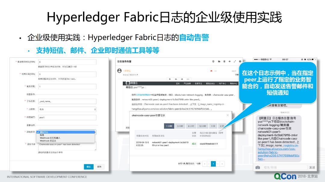 第二個(gè)例子,對(duì)企業(yè)來(lái)說(shuō),可能要對(duì)一些比較敏感的,或者是高優(yōu)先級(jí),或者是對(duì)風(fēng)險(xiǎn)有關(guān)的一些日志信息,實(shí)現(xiàn)自動(dòng)告警的功能,并且這些告警可以去對(duì)接,比如短信,郵件,企業(yè)及時(shí)通信工具如釘釘?shù)鹊纫恍┕ぞ摺T谙旅孢@個(gè)示例中,我們就可以去對(duì)某一個(gè)區(qū)塊鏈應(yīng)用系統(tǒng)來(lái)設(shè)定一些告警規(guī)則,檢查在某一個(gè) Peer 節(jié)點(diǎn)上是否有運(yùn)行某個(gè)特定,如某個(gè)高敏感性 chaincode 應(yīng)用,設(shè)置這樣一條規(guī)則,在配置好規(guī)則以后,后面當(dāng)我業(yè)務(wù)系統(tǒng)一旦滿足這個(gè)條件,那么就會(huì)自動(dòng)通過(guò)郵件,以及短信,向用戶自動(dòng)發(fā)送告警,并且運(yùn)維人員在告警記錄里面可以看到告警的這個(gè)過(guò)程。