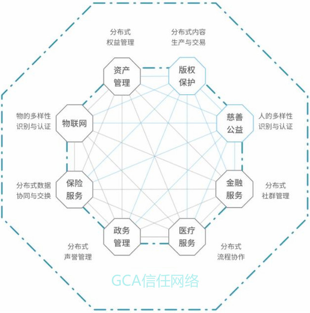 GCA是新一代分布式信任鏈,它架構(gòu)了一個(gè)分布式融合的信任體系,將信任的多樣性在一體化的協(xié)議體系下進(jìn)行協(xié)同,整合分布式多維實(shí)體認(rèn)證體系及各類不同區(qū)塊鏈體系與信息系統(tǒng),納入多源身份認(rèn)證和多源信息交換協(xié)議,并提供不同分布式應(yīng)用場景的開放基礎(chǔ)模塊,實(shí)現(xiàn)分布式點(diǎn)對點(diǎn)的信任體系,構(gòu)建跨鏈、跨系統(tǒng)、跨行業(yè)、跨應(yīng)用和跨終端的分布式信任基礎(chǔ)設(shè)施。