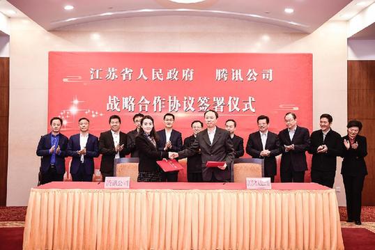 江蘇省副省長馬秋林和騰訊公司黨委副書記、公共政策部總經(jīng)理沈丹代表雙方簽署戰(zhàn)略合作協(xié)議