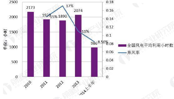 中國風(fēng)電年平均利用小時數(shù)和棄風(fēng)率