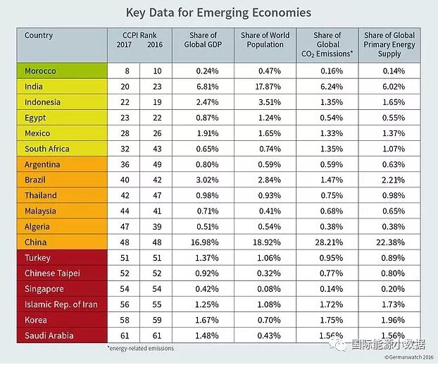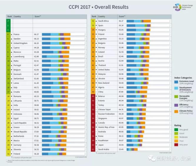 按照以上指標(biāo)評估占全球能源相關(guān)碳排放90%以上的58個國家的氣候績效,前三名出缺;核電大國法國以第4名的成績高居榜首,而以能源轉(zhuǎn)型著稱的德國僅排在29位,中國則排在第48位。