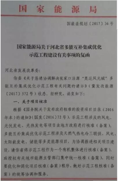 近日,國家能源局向河北省發(fā)改委下發(fā)《關(guān)于河北省多能互補(bǔ)集成優(yōu)化示范工程建設(shè)有關(guān)事項(xiàng)的復(fù)函》,針對河北省發(fā)改委就協(xié)調(diào)解決張家口沽源奧運(yùn)風(fēng)光城多能互補(bǔ)集成優(yōu)化示范工程有關(guān)問題進(jìn)行了回復(fù)。該復(fù)函要求河北