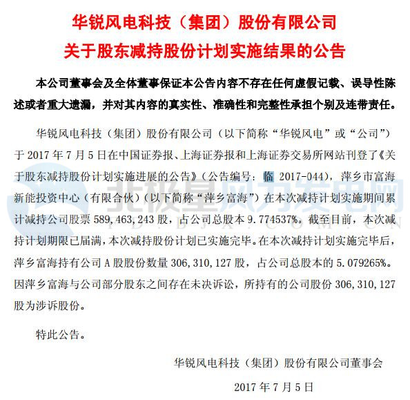 萍鄉(xiāng)富海減持華銳風電5.89億股 占比9.77%