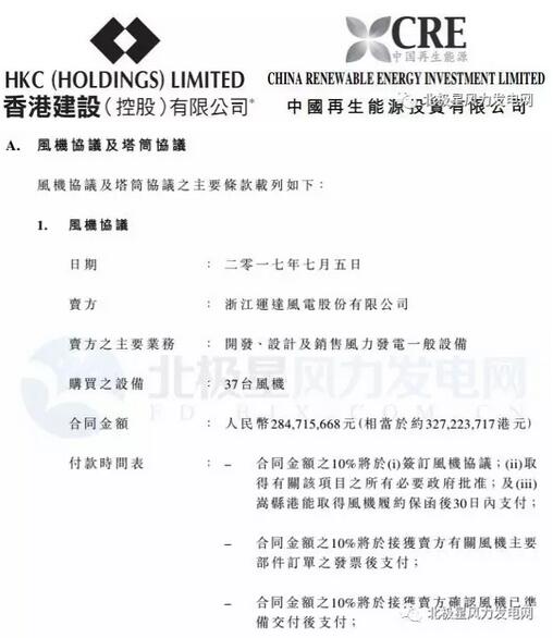 香港上市公司中國再生能源投資有限公司子公司嵩縣港能近日分別與浙江運達風(fēng)電股份有限公司和山東中車同力鋼構(gòu)有限公司簽訂風(fēng)電設(shè)備購買協(xié)議,協(xié)議總金額達3.32億元。