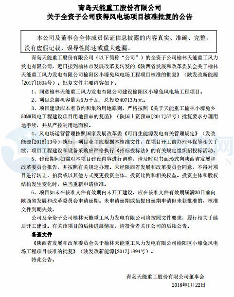 近日,青島天能重工股份有限公司的全資子公司榆林天能重工風(fēng)力發(fā)電有限公司接到《陜西省發(fā)展和改革委員會(huì)關(guān)于榆林天能重工風(fēng)力發(fā)電有限公司...