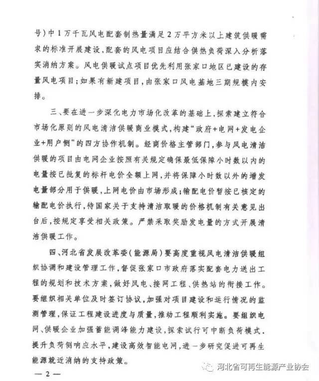 近日,國(guó)家能源局就河北省張家口2017年風(fēng)電清潔供暖示范有關(guān)事項(xiàng)進(jìn)行了復(fù)函,認(rèn)為張家口適宜利用風(fēng)電進(jìn)行分布式供暖。文件中提到,2017年張家口啟動(dòng)尚義縣、懷來縣、崇禮區(qū)、經(jīng)開區(qū)509萬平方米的風(fēng)電供暖試點(diǎn)。項(xiàng)目?jī)?yōu)先利用張家口地區(qū)已建設(shè)的存量風(fēng)電項(xiàng)目,新建項(xiàng)目由張家口風(fēng)電基礎(chǔ)三期規(guī)模內(nèi)安排。此外,要求探索建立符合市場(chǎng)原則的風(fēng)電清潔供暖商業(yè)模式,嚴(yán)禁采取獎(jiǎng)勵(lì)發(fā)電量的方式開展清潔供暖。