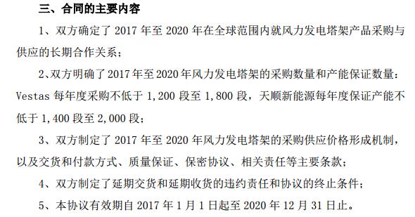 天順風(fēng)能子公司天順新能源與Vestas 簽訂2017-2020年塔架采購框架協(xié)議