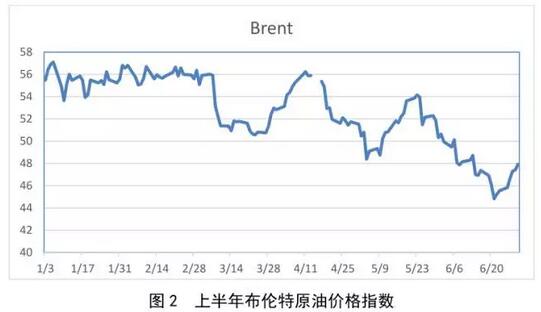 石油方面,國(guó)際上原油供大于求的格局仍然沒(méi)有改變,國(guó)際油價(jià)呈現(xiàn)震蕩下降的形態(tài)。布倫特原油期貨價(jià)格從今年年初的55.47美元/桶下降至6月底47.92美元/桶,累計(jì)下降7.55美元/桶。
