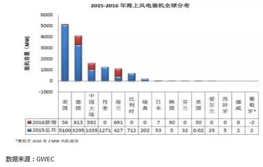 據(jù)全球風(fēng)能理事會(huì)(GWEC)統(tǒng)計(jì),2016年全球海上風(fēng)電新增裝機(jī)2,219MW,主要發(fā)生在七個(gè)市場(chǎng)。盡管裝機(jī)量比去年同期下降了31%,但未來(lái)前景看好,全球14個(gè)市場(chǎng)的海上風(fēng)電裝機(jī)容量累計(jì)為14,384MW。英國(guó)是世界上最大的海上風(fēng)電市場(chǎng),裝機(jī)容量占全球的近36%,其次是德國(guó)占29%。2016年,中國(guó)海上風(fēng)電裝機(jī)量占全球裝機(jī)量的11%,取代了丹麥,躍居第三。其次,丹麥占8.8%,荷蘭7.8%,比利時(shí)5%,瑞典1.4%。除此之外還包括芬蘭、愛爾蘭、西班牙、日本、韓國(guó)、美國(guó)和挪威等市場(chǎng),共同促進(jìn)了整個(gè)海上風(fēng)電的發(fā)展。