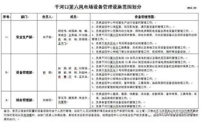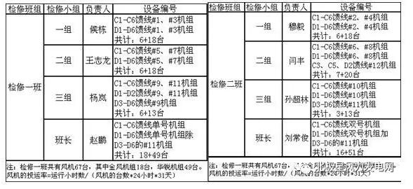 (2)各部門將管理職責繼續(xù)細化,分配至各小組以及個人。下面以設備管理部發(fā)電主要設備風力發(fā)電機組為例,按照專業(yè)和小組進行了管理職責劃分。生產現(xiàn)場設備管理部分為檢修一班和檢修二班,兩個檢修班組各有3個檢修小組組成,管轄設備按照單雙號進行分配,例如:某一饋線1號風機由檢修一班第一檢修小組負責管理工作,某一饋線2號風機由檢修二班第一小組負責管理工作,以此類推。因為風的不確定性,在內對崗位的對標工作中存在發(fā)電量等數(shù)據(jù)的對標,所以,設備沒有按照片區(qū)來劃分。