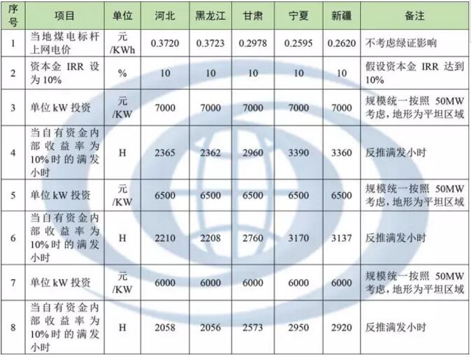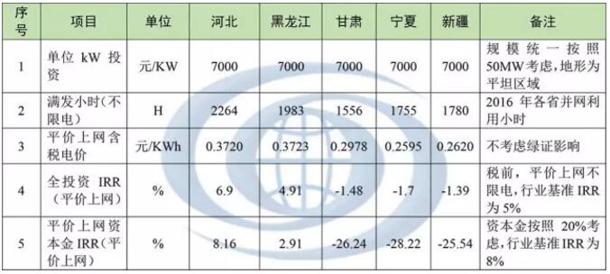 示范項目單從經(jīng)濟型上來看,是否具有可行性?參照2016年公布的各省并網(wǎng)利用小時,單位千瓦投資按照7000元/KW估算,對以上五個省份進行經(jīng)濟性測算結(jié)果如下:
