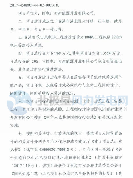 廣西發(fā)改委核準(zhǔn)國電貴港百花山80MW風(fēng)電項目(附文件)