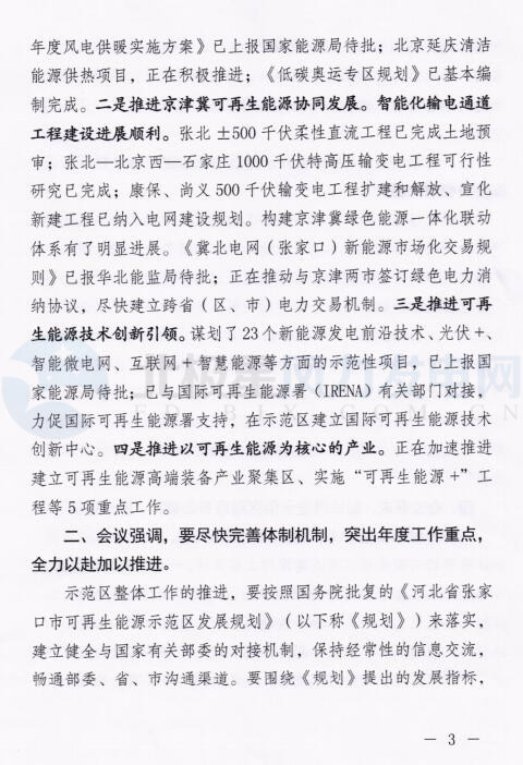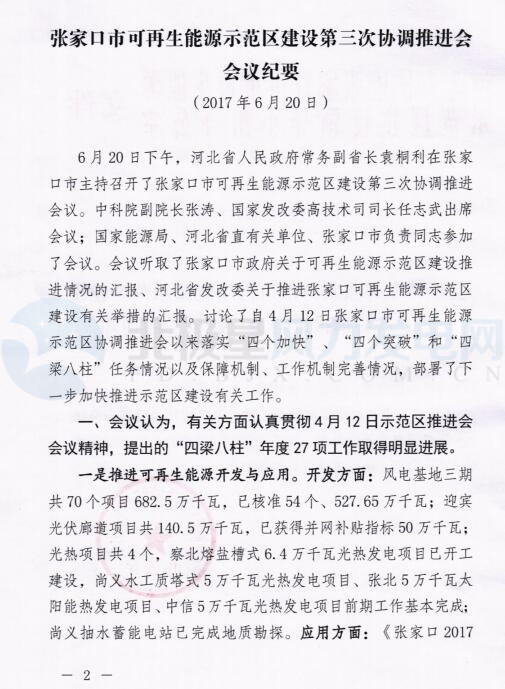 河北發(fā)改委近日轉(zhuǎn)發(fā)《張家口市可再生能源示范區(qū)建設(shè)第三次協(xié)調(diào)推進(jìn)會會議紀(jì)要》,會議紀(jì)要指出,在開發(fā)方面:風(fēng)電基地三期共70個項目682.5萬千瓦,已核準(zhǔn)54個、527.65萬千瓦;應(yīng)用方面:《張家口2017年度風(fēng)電供暖實施方案》已上報國家能源局待批;北京延慶清潔能源供熱項目,正在積極推進(jìn)。以下為會議紀(jì)要全文: