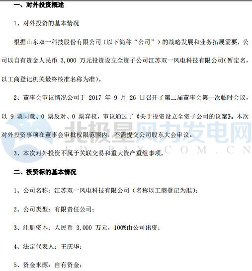 雙一科技昨日發(fā)布公告稱,公司以自有資金人民幣3,000萬元投資設立全資子公司江蘇雙一風電科技有限公司(暫定名)。設立的子公司擬定經(jīng)營范復合材料制品、風電復合材料部件、非金屬模具設計制作銷售,風機、冷卻塔