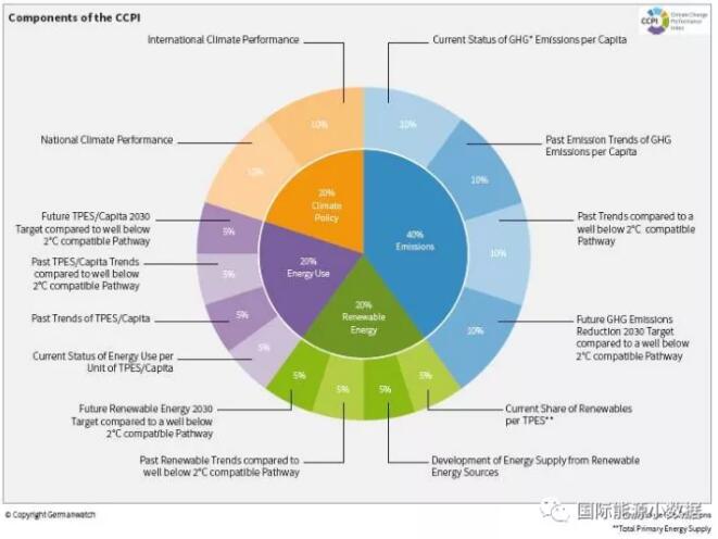 非政府組織Germanwatch.org為評估各國應(yīng)對氣候變化行動的成效,編制了Climate Change Performance Index(氣候變化績效指標(biāo)),簡稱CCPI。如下圖所示,CCPI考慮以下因素: