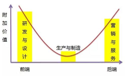 中國是制造業(yè)大國,但還遠(yuǎn)非制造業(yè)強(qiáng)國,隨著內(nèi)部和外部環(huán)境的不斷變化,中國的制造業(yè)也面臨著巨大的挑戰(zhàn)。從世界品牌實(shí)驗(yàn)室 2015 年發(fā)布的數(shù)據(jù)統(tǒng)計來看,在“世界品 牌 500 強(qiáng)”中,中國的企業(yè)也僅占 6%;中國汽車工業(yè)迄今為止所掌握的核心零部件技術(shù)還不到 20%。這就要提到微笑曲線(見圖1),將產(chǎn)業(yè)鏈分為研發(fā)與設(shè)計、生產(chǎn)與制造、營銷與服務(wù)三個區(qū)間,可以看到,生產(chǎn)制造環(huán)節(jié)處在產(chǎn)業(yè)鏈低利潤環(huán)節(jié),而兩端為高端位置,為高利潤環(huán)節(jié)。目前我國大部分制造業(yè)還處在國際產(chǎn)業(yè)價值鏈的低端環(huán)節(jié),存在創(chuàng)新能力不強(qiáng)、核心競爭力不足、產(chǎn)業(yè)集中度低、低端產(chǎn)品生產(chǎn)擴(kuò)張過度而高附加值產(chǎn)品依賴進(jìn)口等問題。