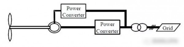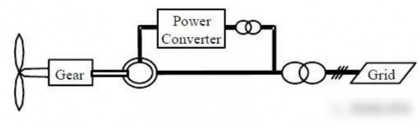 類型B:葉輪主軸經(jīng)高速齒輪箱與發(fā)電機(jī)轉(zhuǎn)子連接,發(fā)電機(jī)采用繞線式雙饋異步發(fā)電機(jī),轉(zhuǎn)子通過整流逆變裝置進(jìn)行交流勵磁,轉(zhuǎn)子側(cè)整流逆變裝置容量約為發(fā)電機(jī)額定容量的20-30%。