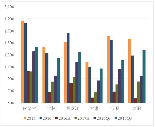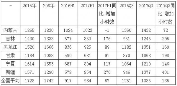 六省利用小時數(shù)全線大幅度改善。2017年上半年,全國風電平均小時數(shù)984小時,同比增加67小時;前三季度,全國風電平均小時數(shù)1386小時,同比增加135小時。六省中,除內(nèi)蒙古外,前三季度同比增加的小時數(shù)均遠優(yōu)于全國平均水平。但內(nèi)蒙古已經(jīng)、由上半年利用小時數(shù)同比為負改善為同比增加72小時。