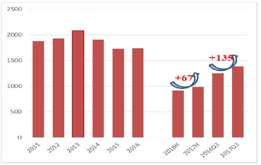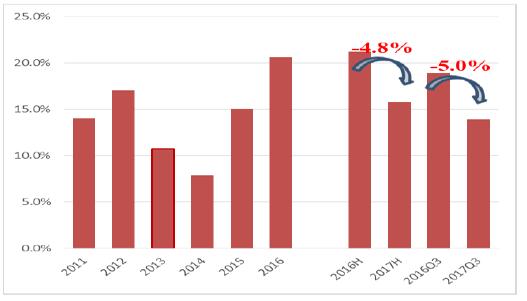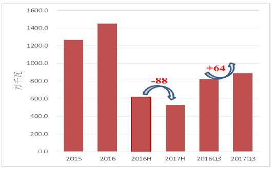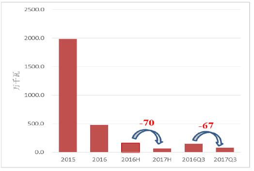 2017年上半年國內(nèi)新增并網(wǎng)容量9.7GW,其中紅六省80萬千瓦,同比下降67萬千瓦;其余省份8.88GW,同比回升64萬千瓦。2017年前三季度,內(nèi)蒙古、黑龍江三省新增并網(wǎng)容量80萬千瓦,同比2016年前三季度少并網(wǎng)67萬千瓦。由于六省要求2017年不新建風電場,并考慮到2016年第4季度六省新增并網(wǎng)容量3.34GW,全年新并網(wǎng)容量4.81GW,相當于2017年六省新增并網(wǎng)容量將比2016年少將近4GW。考慮到2017年并網(wǎng)項目中約2GW為去年完成吊裝,預測2017年全國風電新增裝機較去年少4GW,約19.3GW左右。