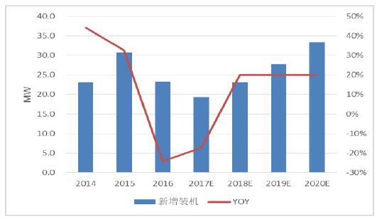 截止2016年底,我國已核準未建設的風電項目容量合計84.0GW,其中2016年新增核準32.4GW;7月28日國家能源局公布2017年將新增核準項目30.7GW,上述項目均有望在2020年前開工,合計114.6GW。根據(jù)國家能源局的風電電價調(diào)整方案,上述114.59GW的項目需要在2020年前開工建設,以獲得0.47-0.60元/千瓦時的上網(wǎng)電價,否則上網(wǎng)電價將被調(diào)整為0.40-0.57元/千瓦時。前文預測,2017年新增裝機容量約19.3GW??紤]到2015年電價調(diào)整發(fā)生搶裝潮,年底風電設備由買方市場轉(zhuǎn)為賣方市場,部分業(yè)主拿不到設備錯過電價,因此預計未來業(yè)主裝機節(jié)奏將略平滑。若以2018-2020年平均增速計算,新增裝機容量分別為23.2GW/27.8GW/33.4GW,年均28.2GW。預計到2020年,國內(nèi)累計裝機容量將達到291GW。 考慮全球市場,2016年新增裝機風電容量為54.6GW,中國市場占比43%。據(jù)預測,2017年全球風電新增裝機容量將超過60GW,并且在未來4年內(nèi)穩(wěn)定增長,2020年全球新增風電裝機達到80GW,年均增速為10%。
