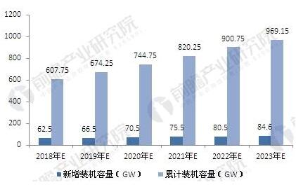 2018-2023年全球風(fēng)電新增和累計(jì)裝機(jī)容量預(yù)測(單位:GW)