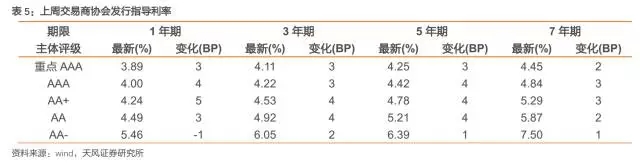 從發(fā)行利率來(lái)看,交易商協(xié)會(huì)公布的發(fā)行指導(dǎo)利率大部分上漲,各等級(jí)變動(dòng)幅度在-1-5BP。具體來(lái)看,1年期各等級(jí)變動(dòng)-1-5BP;3年期各等級(jí)變動(dòng)2-4BP;5年期各等級(jí)變動(dòng)1-4BP;7年期各等級(jí)變動(dòng)1-3BP;10年期及以上各等級(jí)變動(dòng)1-2BP。