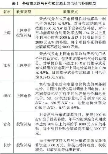 部分省份出臺(tái)了天然氣分布式能源的上網(wǎng)電價(jià)和補(bǔ)貼機(jī)制。目前上海市、江蘇省、浙江省、長(zhǎng)沙市、青島市等省市出臺(tái)了天然氣分布式能源的上網(wǎng)電價(jià)和補(bǔ)貼機(jī)制,其中上海市采用上網(wǎng)電價(jià)和投資補(bǔ)貼相結(jié)合的機(jī)制,上網(wǎng)電價(jià)為單一制電價(jià);江蘇省、浙江省均采用兩部制上網(wǎng)電價(jià)政策;青島市、長(zhǎng)沙市主要采用投資補(bǔ)貼機(jī)制。