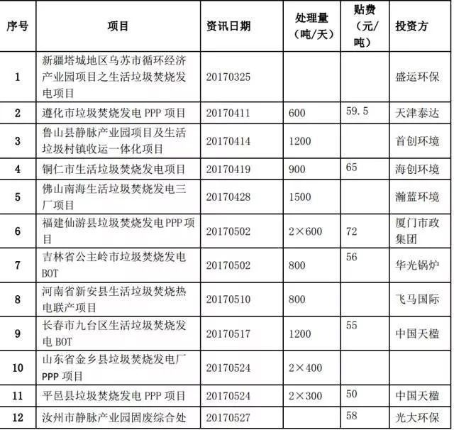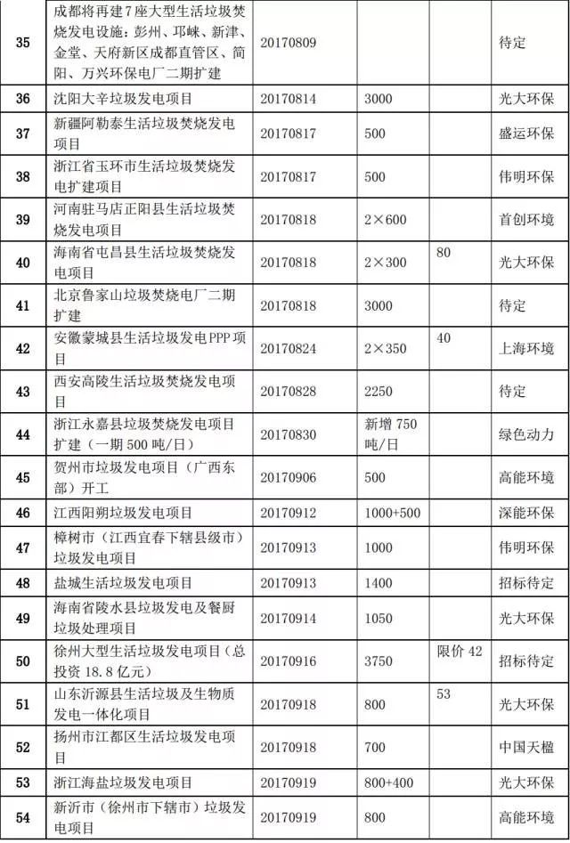 2017年以來(lái)全國(guó)垃圾發(fā)電擬建項(xiàng)目匯總
