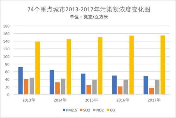 與全國(guó)的臭氧濃度增加的趨勢(shì)相一致,2017年的74個(gè)重點(diǎn)城市臭氧平均濃度值為155微克/立方米,比2013年增加了11.5%,其中32個(gè)城市超過國(guó)家二級(jí)標(biāo)準(zhǔn)(160微克/立方米)。53個(gè)城市出現(xiàn)臭氧污染加劇的現(xiàn)象,其中湖州、邢臺(tái)、肇慶、太原、哈爾濱、廈門市的同比上升幅度達(dá)到30%以上。