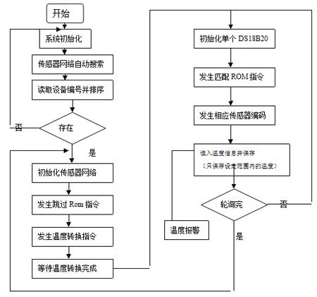 首先利用DSl8B20的內(nèi)部報警上限寄存器存放溫度傳感器的編號,并將其編號貼在安裝完傳感器的電纜表面,這樣巡檢時候可根據(jù)編號查詢報警值得知哪條電纜異常。流程圖如下所示。
